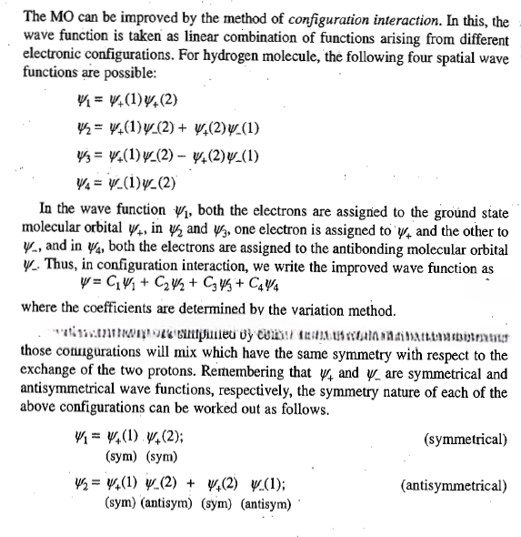 The MO can be improved by the method of configuration interaction. In this, the wave function is taken as linear combination of functions arising from different electronic configurations. For hydrogen molecule, the following four spatial wave functions are possible: