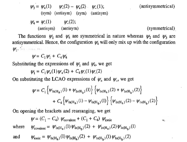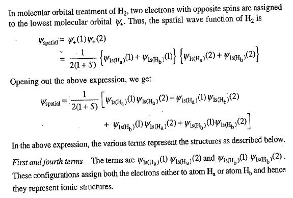 Since the coefficients of all the terms are identical, it follows that MO treatment gives equal weightage to the ionic and covalent structures. It is expected that the MO function will be poor at large internuclear separations since the dissociation products will be an equal mixture of ions and atom. In actual practice we get two hydrogen atoms. On the other hand, for very short internuclear distances one expects that there will also be some chance of finding both the electrons in the same atomic orbital. Thus, MO treatment does take into account this fact, but perhaps gives more weightage to this fact than what actually exists in the molecule.