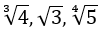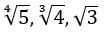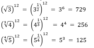 The least common multiple of 2 (for √3), 3 (for ∛4), and 4 (for ∜5) is 12. So, we'll raise each number to the power of 12.