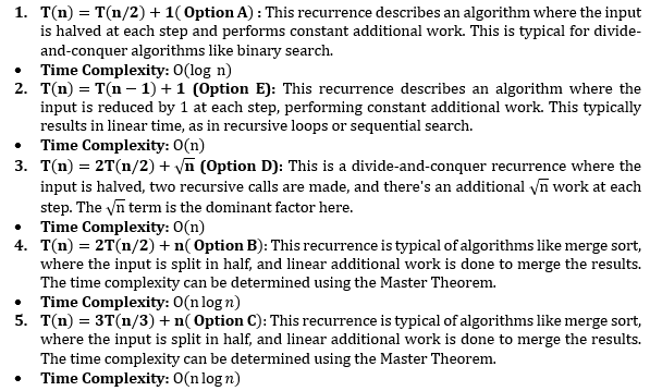 Arrange the following recurrence relations in increasing order of their time capacity. A. T(n) = T(n/2) + 1 B. T(n) = 2T(n/2) + n C. T(n) = 3