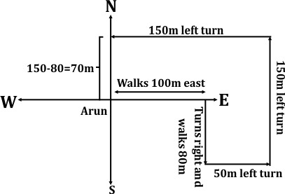 Rohit walks 50 metres North, then turns right and walks 30 metres, then again turns right and walks 15 metres.