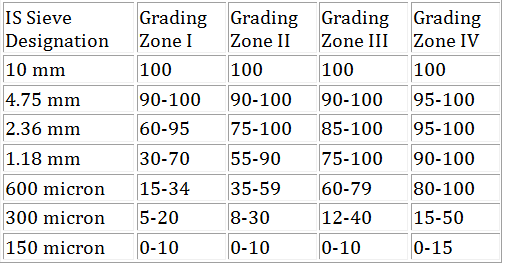 There are 4 types of grading zones for fine aggregates(sand) namely Grading zone I, II, III, IV.