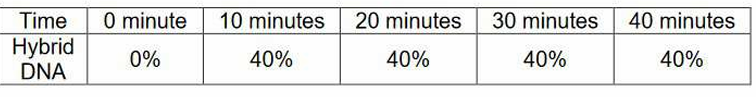 - At 20, 30, and 40 minutes: The percentage of hybrid DNA remained at 40%, indicating that no further DNA replication was occurring beyond the first 10 minutes.