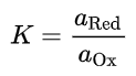 At chemical equilibrium, the ratio Qr of the activity of the reaction product (aRed) by the reagent activity (aOx) is equal to the equilibrium constant K of the half-reaction: