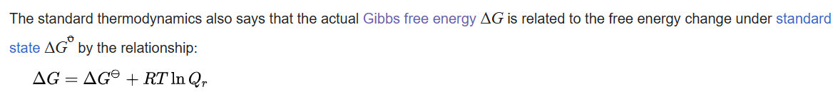 The reaction quotient (Qr), also often called the ion activity product (IAP), is the ratio between the chemical activities (a) of the reduced form (the reductant ,aRed) and the oxidized form (the oxidant ,aOx). The chemical activity of a dissolved species corresponds to its true thermodynamic concentration taking into account the electrical interactions between all ions present in solution at elevated concentrations. For a given dissolved species, its chemical activity (a) is the product of its activity coefficient (γ) by its molar(mol/L solution), or molal (mol/kg water),concentration (C): a = γ C. So, if the concentration (C, also denoted here below with square brackets [ ]) of all the dissolved species of interest are sufficiently low and that their activity coefficients are close to unity, their chemical activities can be approximated by their concentrations as commonly done when simplifying, or idealizing, a reaction for didactic purposes: