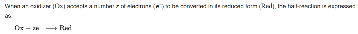 The Nernst equation is a chemical thermodynamical relationship that permits the calculation of the reduction potential of a reaction (half-cell or full cell reaction) from the standard electrode potential, absolute temperature, the number of electrons involved in the redox reaction, and activities (often approximated by concentrations) of the chemical species undergoing reduction and oxidation respectively.
