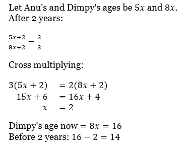 At present, the ratio between the ages of Anu and Dimpy is 5 : 8. After 2 years, the ratio of their ages will become 2 : 3. What was Dimpy’s age before 2 years?