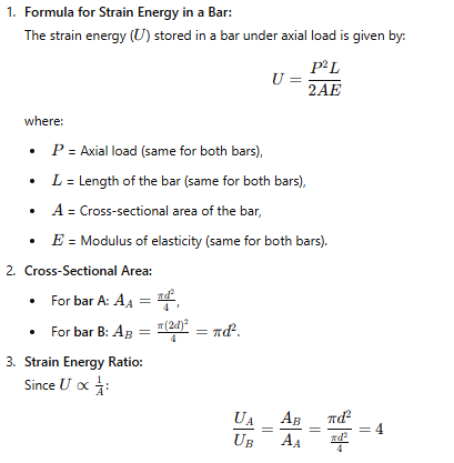 Bar A and bar B are made up of the same material and are of same length. But bar A has diameter 'd' while bar B has diameter '2d'. If both are subjected to same axial load, the ratio of strain energy of bar A to strain energy of bar B is: