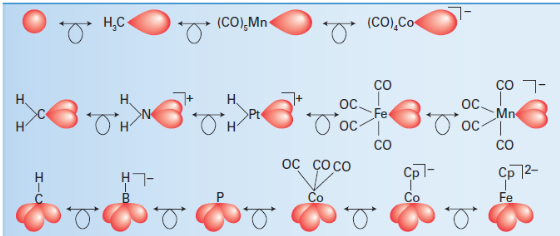 .The origin of the name is the lobe-like shape of a hybrid orbital in a molecular fragment. Two fragments are isolobal if their highest energy orbitals have the same symmetry (such as the σ symmetry of the H1s and a Csp3 hybrid orbital), similar energies, and the same electron occupation (one in each case in H1s and Csp3).Table lists some selected isolobal fragments and the first line shows isolobal fragments with a single frontier orbital. The recognition of this family permits us to anticipate by analogy with H−H that molecules such as H3C−CH3and (OC)5Mn−CH3can be formed. The second line of Table lists some isolobal fragments with two frontier orbitals, and the third line lists some with three.
