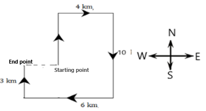 Bharti starts from point and drives 7 km towards north. Then she turns right, drives 4 km , turns right and drives 10km . She then turns right and walks 6 km . She takes a final right turn, drives 3 km and stops at point . How far and in which direction should she drive to reach end point from starting point ? (All turns are turns only)