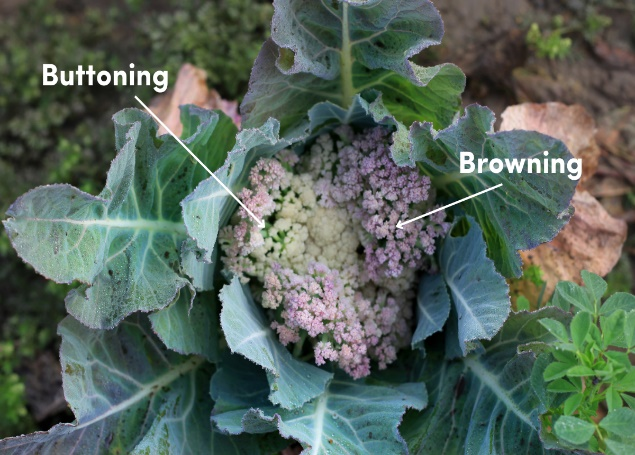 Nitrogen (N) deficiency causes buttoning in cauliflower, leading to small, underdeveloped heads.