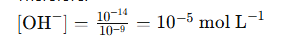 2. Since water dissociation produces equal amounts of H⁺ and OH⁻, the concentration of OH⁻ ions can be calculated using the water dissociation constant (Kw):