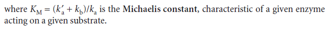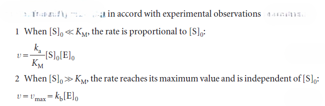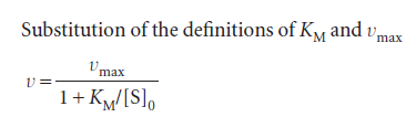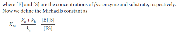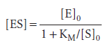 and note that KM has the same units as molar concentration. To express the rate law in terms of the concentrations of enzyme and substrate added, we note that [E]0=[E] + [ES]. Moreover, because the substrate is typically in large excess relative to the enzyme, the free substrate concentration is approximately equal to the initial substrate concentration and we can write [S] ≈ [S]0. It then follows that: