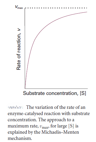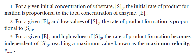 Experimental studies of enzyme kinetics are typically conducted by monitoring the initial rate of product formation in a solution in which the enzyme is present at very low concentration. Indeed, enzymes are such efficient catalysts that significant accelerations may be observed even when their concentration is more than three orders of magnitude smaller than that of the substrate. The principal features of many enzyme-catalysed reactions are as follows: