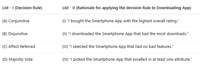 (A) Conjunctive → (III): The conjunctive rule sets minimum required levels for each attribute. A product is chosen only if it meets or exceeds all minimum criteria. So, selecting an app that "had no bad features" reflects this rule, as the decision-maker is eliminating any option with below-threshold performance on any attribute.