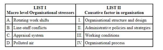 - D. Polluted air → III. Working conditions: Polluted air is a physical aspect affecting the working environment directly.