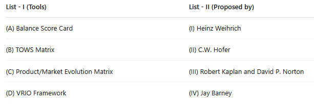 C.W. Hofer proposed this matrix, which is used for analyzing strategies based on market and product evolution, helping firms decide on innovation, diversification, or consolidation.(D) VRIO Framework – (IV) Jay Barney