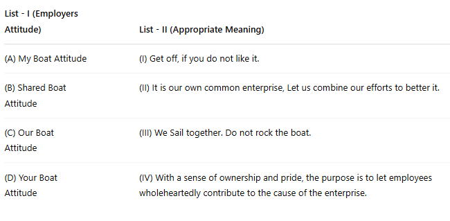 This shows a sense of shared responsibility, where both employer and employees are on the same journey. However, it also implies maintenance of status quo, avoiding conflict or disruption.(C) Our Boat Attitude → (II) It is our own common enterprise. Let us combine our efforts to better it.
