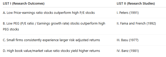 A. Low Price-earnings ratio stocks outperform high Price-earnings ratio stocks: This was first documented by Basu (1977) who found that stocks with low P/E ratios generally yield higher average returns. Hence, A matches with III.