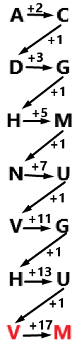 Choose the next word-pair in the series: AC, DG, HM, NU, VG, HU, ?