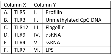- B-v (TLR3 - ssRNA): Incorrect, TLR3 actually binds dsRNA (double-stranded RNA), not ssRNA. ssRNA is recognized by TLR7 and TLR8.