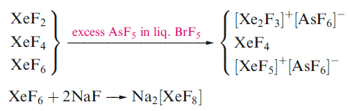 The most stable Xe compounds are the colourless fluorides XeF2, XeF4 and XeF6. XeF6 always forms with contamination by the lower fluorides. Separation of XeF4 from a mixture involves preferential complexation of XeF2 and XeF6 and the XeF4 is then removed in vacuo, while separation of XeF6 involves reaction followed by thermal decomposition of the complex.
