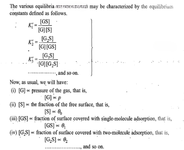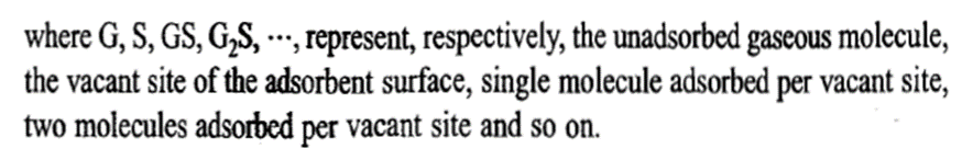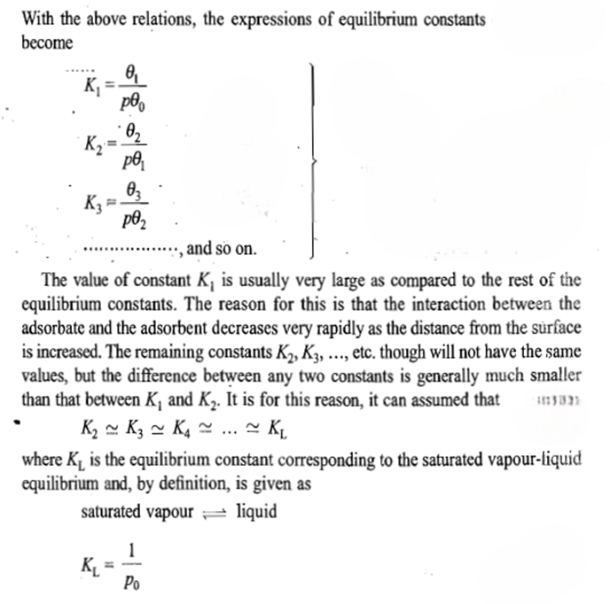 The adsorption isotherms shown in figure have been interpreted by Brunauer, Emmett and Teller on the basis of formation of multilayer. They derived a theoretical expression, known as BET adsorption isotherm. While deriving the expression, it was assumed that interactions amongst the adsorbed molecules in the adsorption layer along the adsorbent surface are neglected.