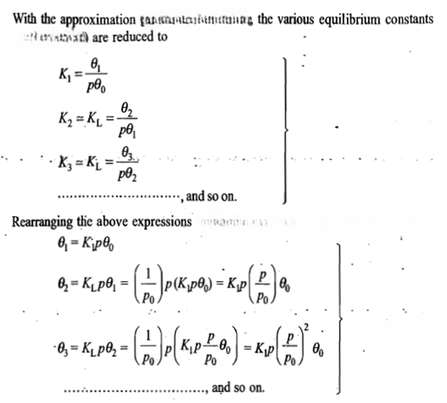 The adsorption of gases on the surface of an adsorbent is no more monolayer at high pressures and low temperatures. At high pressure, the number of molecules striking per unit area of the surface per unit time is quite high. On the other hand, at low temperature the thermal energy of molecules is not sufficiently large to overcome the forces of attraction (van der Waals forces of attraction) between the adsorbed molecule and nearby unadsorbed molecule. This results into the multilayer adsorption, i.e. more than one layer of molecules is adsorbed at the surface. The formation of multilayer is very much enhanced as the pressure of the gas reaches near to the saturation vapour pressure of the liquefied adsorbent at the given experimental temperature.