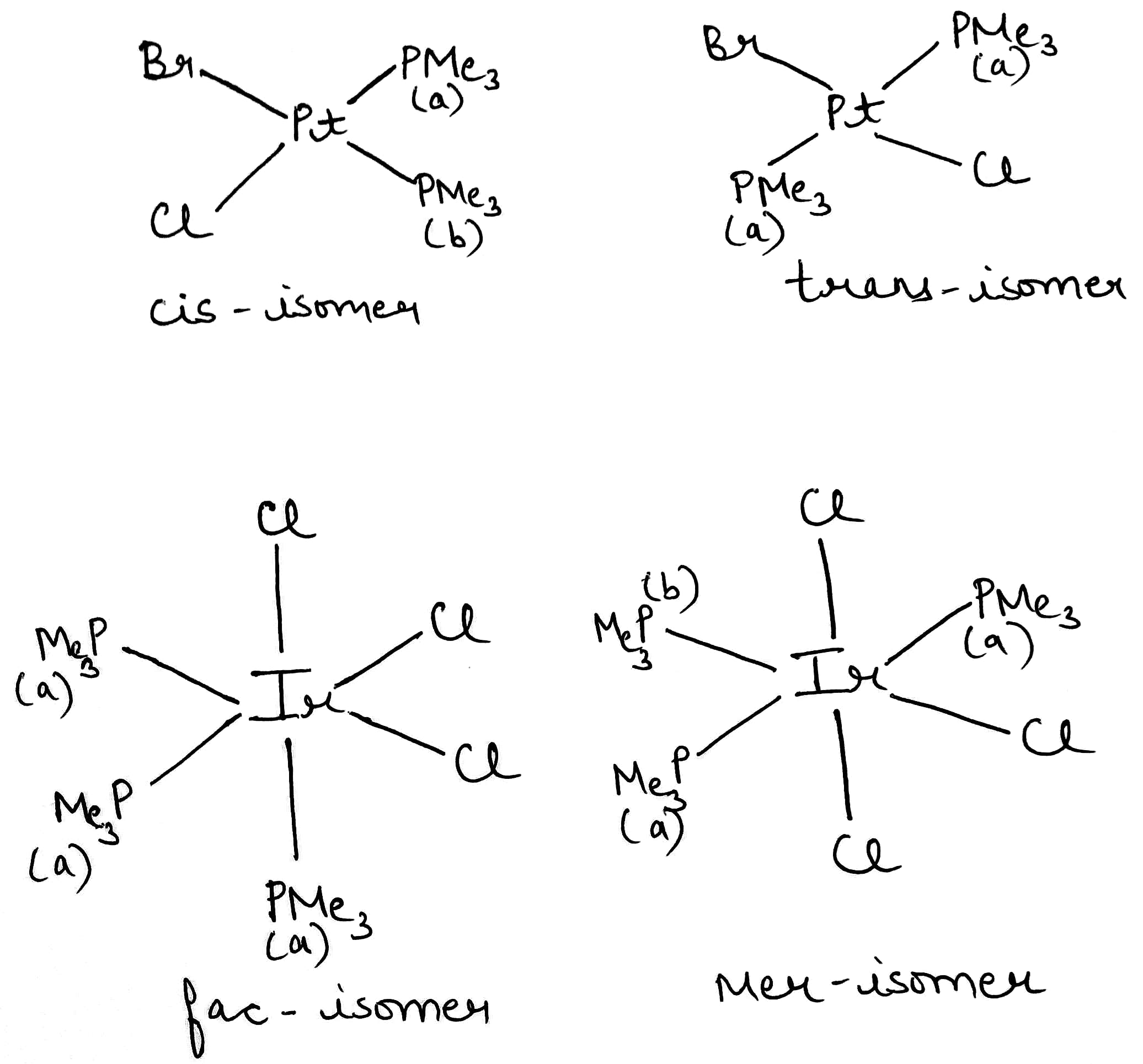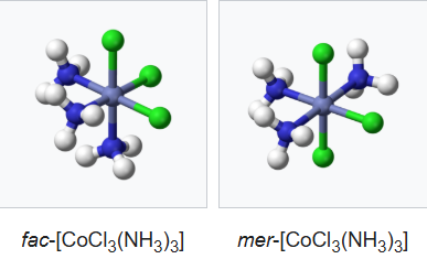 A related type of isomerism in octahedral MX3Y3 complexes is facial–meridional (or fac–mer) isomerism, in which different numbers of ligands are cis or trans to each other. When three identical ligands occupy one face of an octahedron, the isomer is said to be facial, or fac. In a fac isomer, any two identical ligands are adjacent or cis to each other. If these three ligands and the metal ion are in one plane, the isomer is said to be meridional, or mer. A mer isomer can be considered as a combination of a trans and a cis, since it contains both trans and cis pairs of identical ligands.