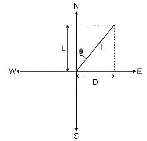 D = Departure is the projection on East-West meridian