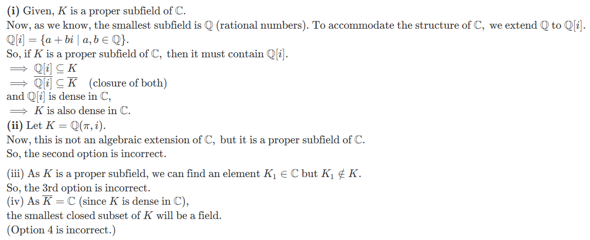 (iii) As K is a proper subfield, we can find an element K1∈C but K1∈/K.So, the 3rd option is incorrect.(iv) As K=C(since K is dense in C),the smallest closed subset of K will be a field.(Option 4 is incorrect.)