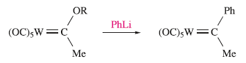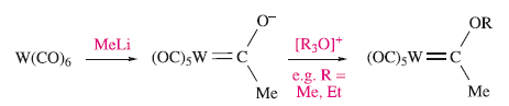 Compounds of the type formed in the above reaction are called Fischer-type carbenes. They possess a low oxidation state metal, a heteroatom (O in this example) and an electrophilic carbene centre (i.e. subject to attack by nucleophiles).