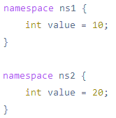 3. Identifiers in different namespaces are fully qualified by their namespace name (e.g., A::value, B::value).