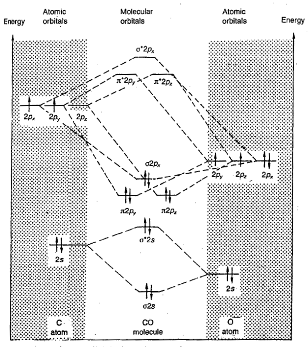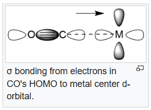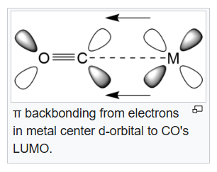 In chemistry, pi backbonding or π backbonding is a π-bonding interaction between a filled (or half filled) orbital of a transition metal atom and a vacant orbital on an adjacent ion or molecule. The ligands involved in π backbonding can be broken into three groups: carbonyls and nitrogen analogs, alkenes and alkynes, and phosphines. The electrons are partially transferred from a d-orbital of the metal to anti-bonding molecular orbitals of CO (and its analogs). This electron-transfer strengthens the metal–C bond and weakens the C–O bond. The strengthening of the M–CO bond is reflected in increases of the vibrational frequencies for the M–C bond. Furthermore, the M–CO bond length is shortened. The weakening of the C–O bond is indicated by a decrease in the wavenumber of the νCO band(s) from that for free CO (2143 cm-1).