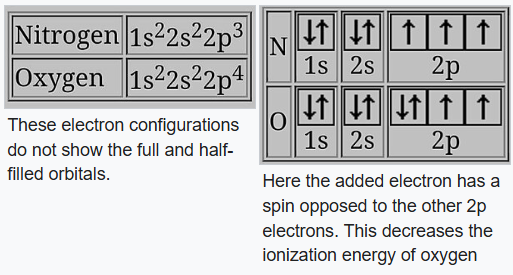 There are exceptions to the general trend of rising ionization energies within a period. For example, the value decreases from (7N : 14.5 eV) to oxygen (8O : 13.6 eV). This dip can be explained in terms of electron configurations.