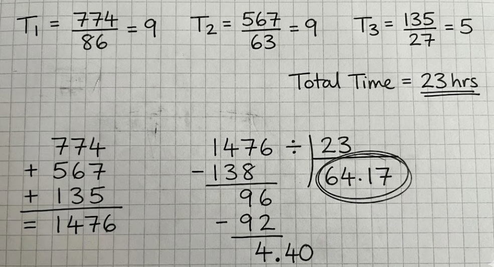 774 km at 86 km/hr, 567 km at 63 km/hr, 135 km at 27 km/hr