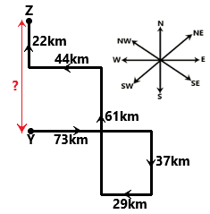 Deepak starts from Point Y and drives 73 km towards east. He then takes a right turn, drives 37 km, turns right and drives 29 km. He then takes a right turn and drives 61 km. He takes a left turn, drives 44 km. He then turns right, drives 22 km and stops at Point Z. How far (shortest distance) and towards which direction should he drive in order to reach Point Y again? (All turns are 90-degree turns only unless specified.)