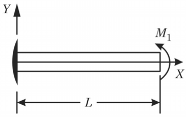 For a cantilever beam with a moment M1 applied at the free end:∙The bending moment M(x) is constant along the beam:M(x)=M1(for all 0≤x≤L).Differential Equation of the Elastic CurveThe elastic curve is governed by:EIdx2d2y=M(x).Substitute M(x)=M1:EIdx2d2y=M1.Integrate to Find Slope and DeflectionFirst Integration (Slope θ(x)):EIdxdy=M1x+C1.Boundary Condition: At the fixed end (x=0), slope dxdy=0:0=M1⋅0+C1=>C1=0.Thus:dxdy=EIM1x.Second Integration (Deflection y(x)):EIy(x)=2M1x2+C2.Boundary Condition: At the fixed end (x=0), deflection y=0:0=2M1⋅02+C2=>C2=0.Thus:y(x)=2EIM1x2.