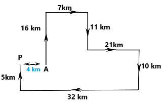 R starts from Point A and drives 2 km towards the south. He then takes a left turn, drives 7 km, turns left and drives 6 km. He then takes a left turn and drives 14 km. He takes a final left turn, drives 4 km and stops at Point P. How far (shortest distance) and towards which direction should he drive in order to reach Point A again? (All turns are 90-degree turns only, unless specified.)