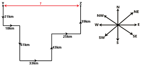 Govind starts from Point Y and drives 12 km towards west. He then turns right and drives 37 km, takes a left turn, drives 18 km, turns left and drives 63 km. He then takes a right turn and drives 19 km. He takes a right turn, drives 35 km, turns left, drives 32 km, then turns left and drives 9 km to stop at Point Z. How far (shortest distance) and towards which direction should he drive in order to reach Point Y again? (All turns are 90° turns only unless specified.)