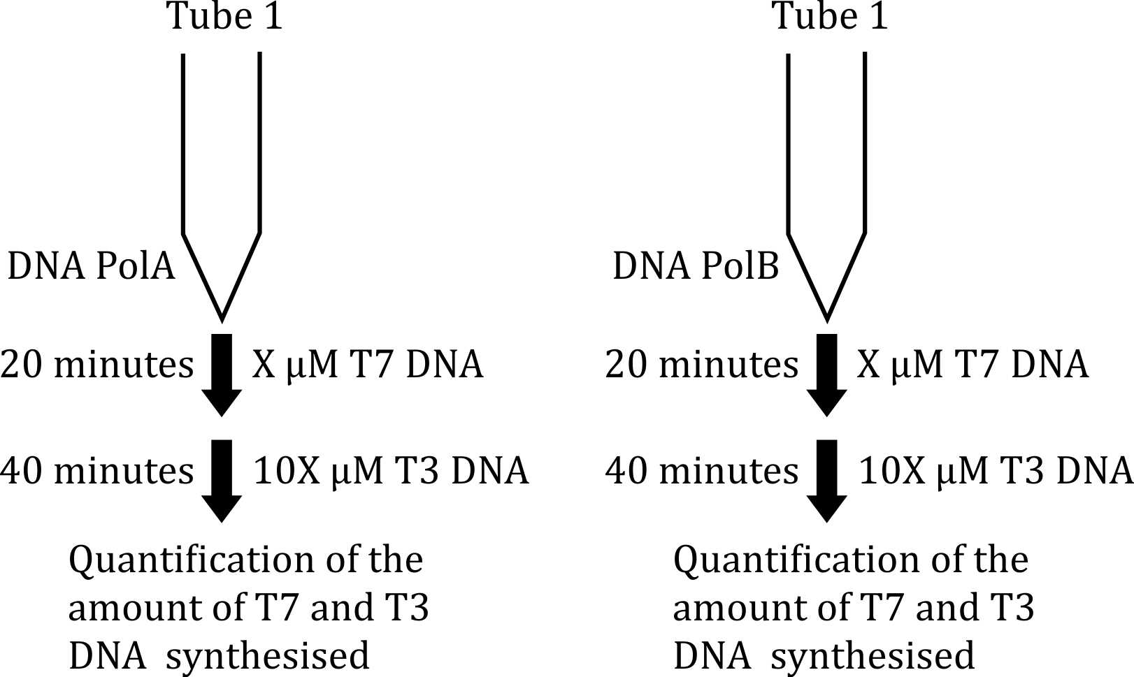 - Tube 1 (PolA) → More T3 DNA (accumulates over time).