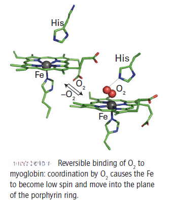 The Fe in deoxymyoglobin is five-coordinate, high-spin, and lies above the plane of the ring. When O2 binds it is coordinated end-on to the Fe atom, the electronic structure of which is tuned by the F helix histidine ligand. The unbound end of the O2 molecule is fastened by a hydrogen bond to the imidazole-NH of the histidine in helix E. The coordination of O2 (a strong-field π-acceptor ligand) causes the Fe(II) to switch from high spin (equivalent to t2g4 eg2) to low-spin (t2g6) and, with no d electrons in antibonding orbitals, to shrink slightly and move into the plane of the ring. The bonding is often expressed in terms of Fe(II) coordination by singlet O2, in which the doubly occupied antibonding 2πg orbital of O2 acts as a sigma donor and the empty 2πg orbital of O2 accepts an electron pair from the Fe. An alternative description is often considered, in which the bonding is expressed in terms of low-spin Fe(III) coordinated by superoxide, O2-. With this model, the formation of metmyoglobin by reaction with anions is a simple ligand displacement.