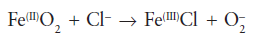Deoxymyoglobin (Mb) is bluish red and contains Fe(II); this is the oxidation state that binds O2 to give the familiar bright red oxymyoglobin (oxyMb). In some instances deoxymyoglobin becomes oxidized to Fe(III), which is called metmyoglobin (metMb) and is unable to bind O2. This oxidation may occur by a ligand substitution-induced redox reaction in which Cl- ions displace bound O2 as superoxide:
