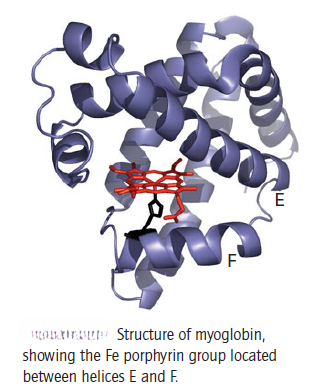 Myoglobin is an Fe protein that coordinates O2 reversibly and controls its concentration in tissue. The molecule contains several regions of alpha helix, implying mobility, with the single Fe porphyrin group located in a cleft between helices E and F. Two propionate substituents on the porphyrin interact with solvent H2O molecules on the surface of the protein. The fifth ligand to the Fe is provided by a histidine-N from helix F, and the sixth position is the site at which O2 is coordinated. In common terminology, the side of the haem plane at which exchangeable ligands are bound is known as the distal region, while that below the haem plane is known as the proximal region. The histidine on helix F is one of two that are present in all species. Such ‘highly conserved’ amino acids are a strong indication that evolution has determined that they are essential for function. The other conserved histidine is located on helix E.