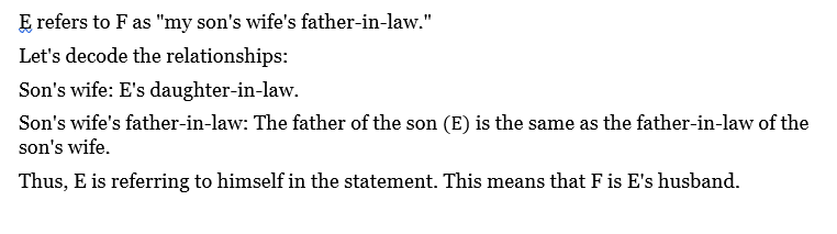 E said to F, “You are my son’s wife’s father-in-law. “How is F related to E?
