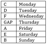 The exams of A, B, C, D, E, and F are on different days of the week starting from Monday and ending on Sunday.