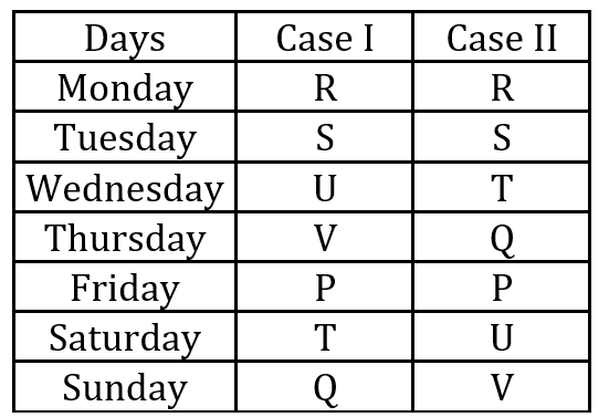 Given - Each of P, Q, R, S, T, U and V has an exam on a different day of a week starting from Monday and ending on Sunday of the same week. P has an exam on Friday. Only 2 people have an exam between P and S. U has an exam immediately before V, and Q has an exam immediately after T. Only 2 people have an exam between R and V.