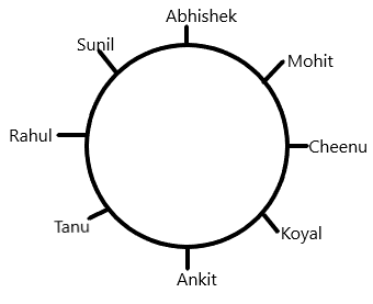 · Eight athletes Sunil, Abhishek, Mohit, Cheenu, Rahul, Tanu, Koyal and Ankit are sitting around a circular table facing opposite to the centre.