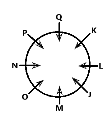 Seven friends M, N, J, K, P, Q and R are sitting in a circle facing at the centre but not necessarily in the same order.