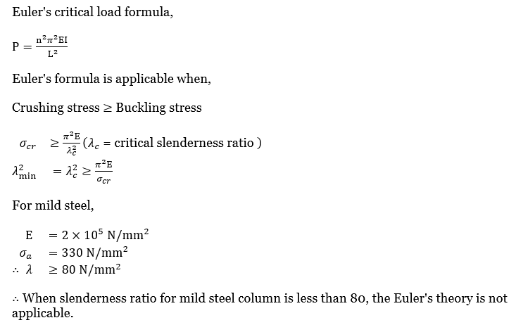 Euler’s formula for buckling is applicable primarily for long, slender columns where buckling occurs well before the material yields. This is characterized by a high slenderness ratio (λ), typically above a certain threshold. In practice, Euler’s formula becomes less accurate as the slenderness ratio decreases because, at lower slenderness ratios (such as below 80 for mild steel), the column tends to fail by yielding rather than elastic buckling. In such cases, other approaches (like the Rankine-Gordon formula) are often used to predict column behavior more accurately.